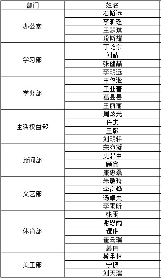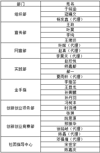 根据自愿报名,资格审查及民主评议答辩,经学院审核,2017-2018届团委、学生会副级学生干部拟聘任结果公示如下,如有异议请于9月6日10:00前到学生工作办公室(基础楼419室)反映。