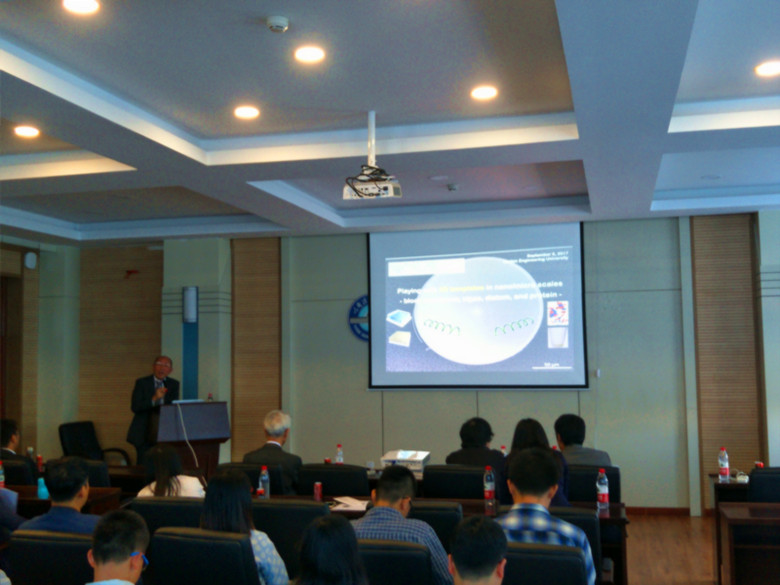 2017年9月8日上午, pp电子官方网站聘任日本同志社大学哈里斯科学研究所教授弥田智一(Tomokazu Iyoda)为我校客座教授。聘任仪式在pp电子官方网站举行,学院党委书记靳雪滨、副院长李峻青及相关教师参加了受聘仪式,靳雪滨为其颁发聘书并佩戴校徽。聘任仪式结束后,弥田智一教授为我院师生作了一场名为《Playing with 3D Template in Nano/Micro Scales-Block Copolymer, Alga, Diatom, and Protein》的讲座。