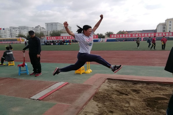 在这片体育场内,留下了许多身着黄蓝相间运动服化人的汗水,更有夺目的成绩:在男子1500米的比赛中,汤梅检同学获得了第二名的好成绩;在女子400 米比赛中,沈丹彤获得第二名,侯颖获得第四名;在男子跳高项目中,木扎帕尔获得第三名;女子跳高项目中文莉获得第一名,吴夙彤获得第二名;在团体项目中,跳长绳获得全校第一名;8*100米接力获得第三名。其他运动员也获得了让人满意的好成绩。