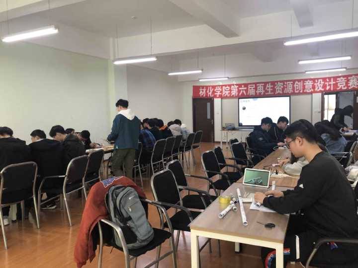 2019年3月30日上午8:30,pp电子官方网站举办了以“再生于身边,实践于手边”为主题的第六届再生资源创意设计大赛,本次比赛分为两个环节:知识竞赛答题和创意设计实践,并分别在启航334和338活动室举办。本次比赛第一环节知识竞赛为抢答模式,由科协成员用ppt展示题目,选手举手抢答题目,由裁判对举手的小组进行判定,并将结果统计进入表格,并由裁判对比赛成绩进行排序,并筛选出晋级第二轮竞赛名单,最终选出了12组选手进入第二环节。