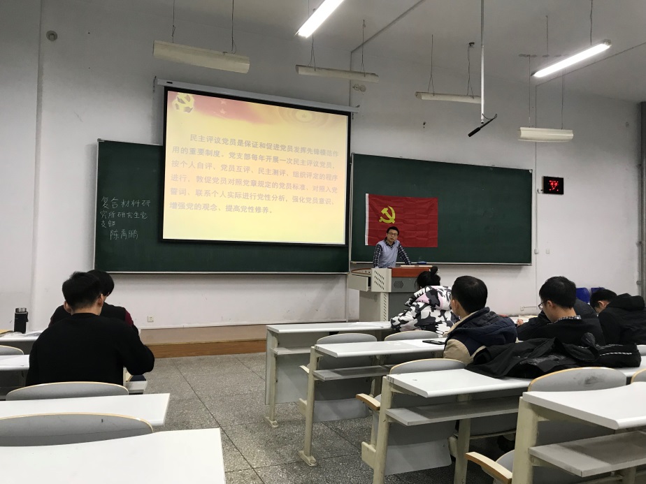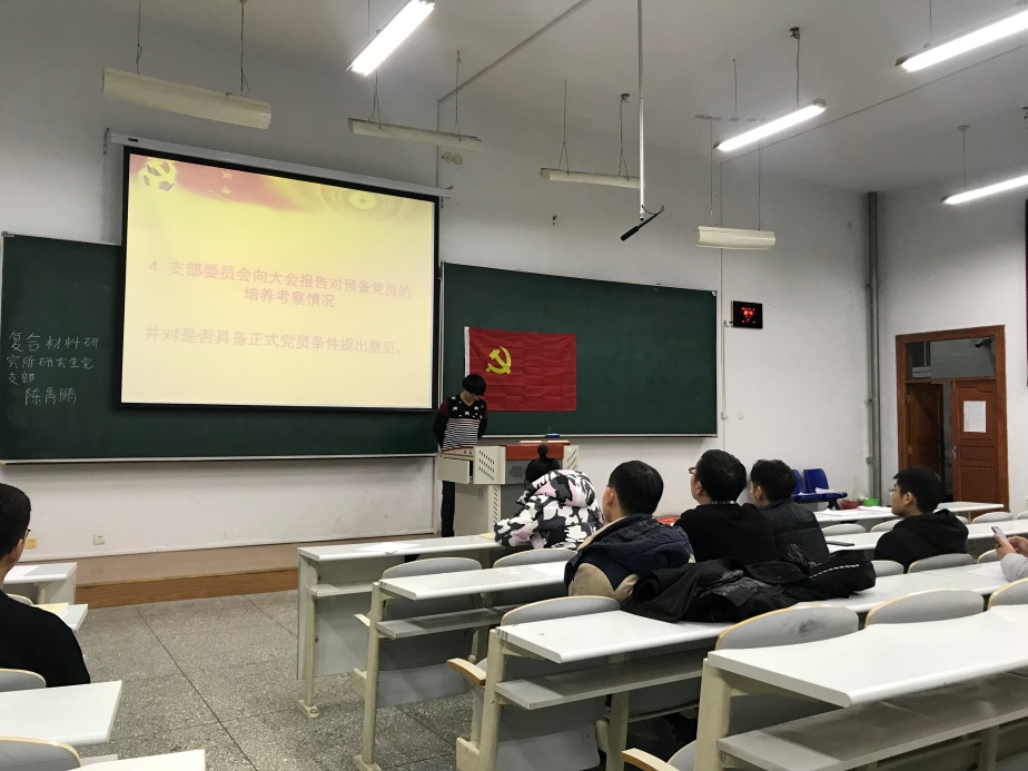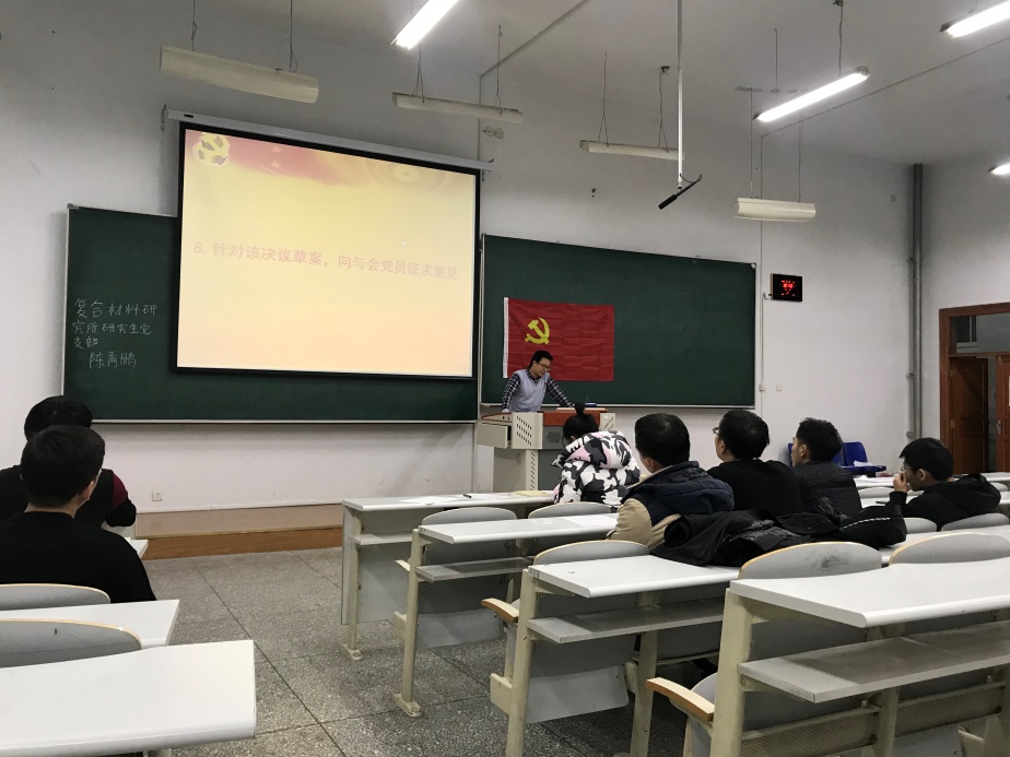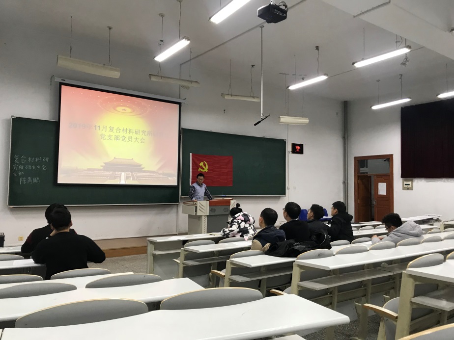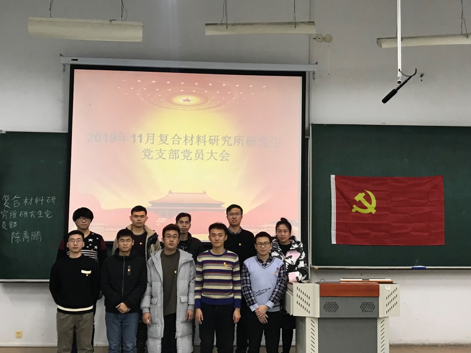 2019年11月27日,复合材料研究所研究生党支部党员在1#S203教室顺利召开了2019-2020学年支部全体党员大会,主题为:“预备党员转正、自检自查、学习《习近平关于‘不忘初心,牢记使命’论述摘编》心得体会”。复合材料研究所11名学生党员参加此次大会。大会由复合材料研究所研究生党支部支部书记边城鑫同志主持。