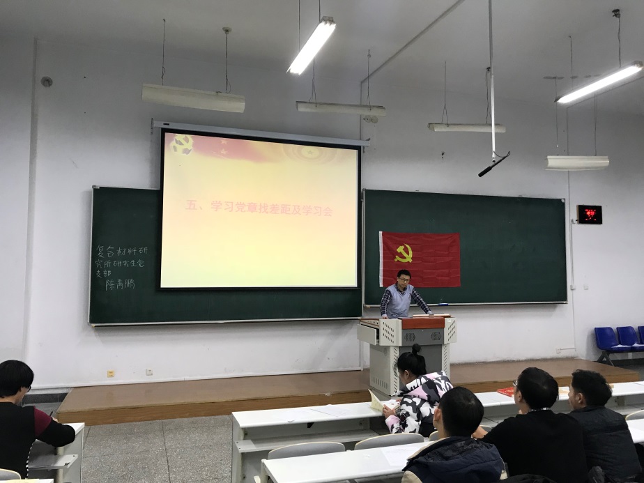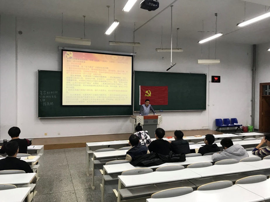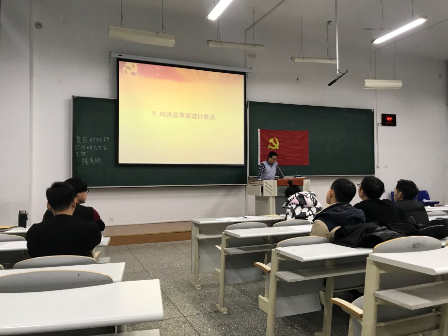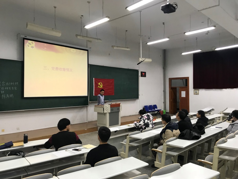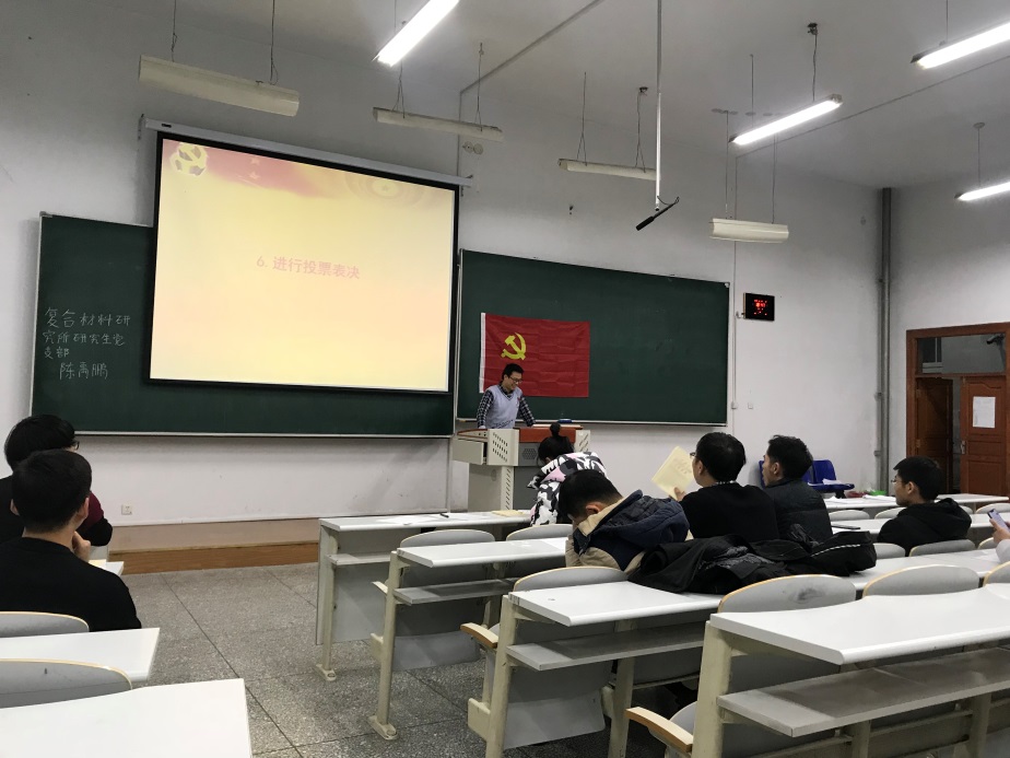 2019年11月27日,复合材料研究所研究生党支部党员在1#S203教室顺利召开了2019-2020学年支部全体党员大会,主题为:“预备党员转正、自检自查、学习《习近平关于‘不忘初心,牢记使命’论述摘编》心得体会”。复合材料研究所11名学生党员参加此次大会。大会由复合材料研究所研究生党支部支部书记边城鑫同志主持。
