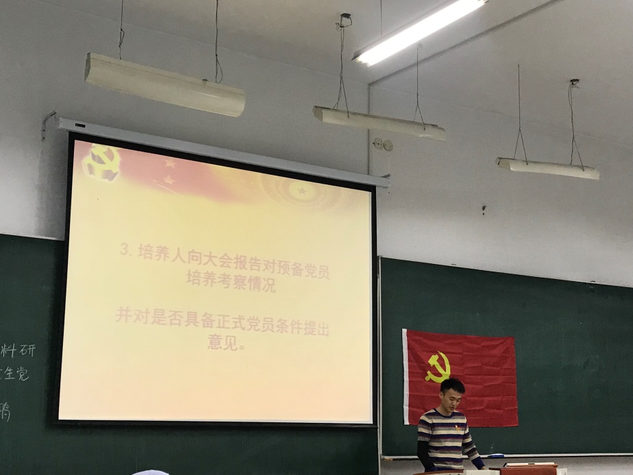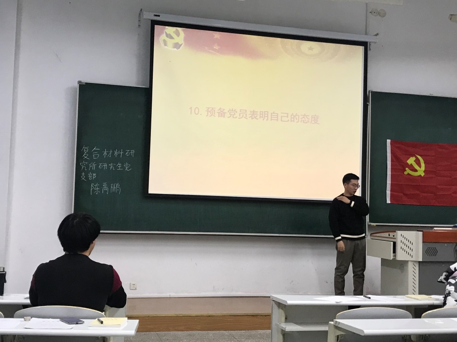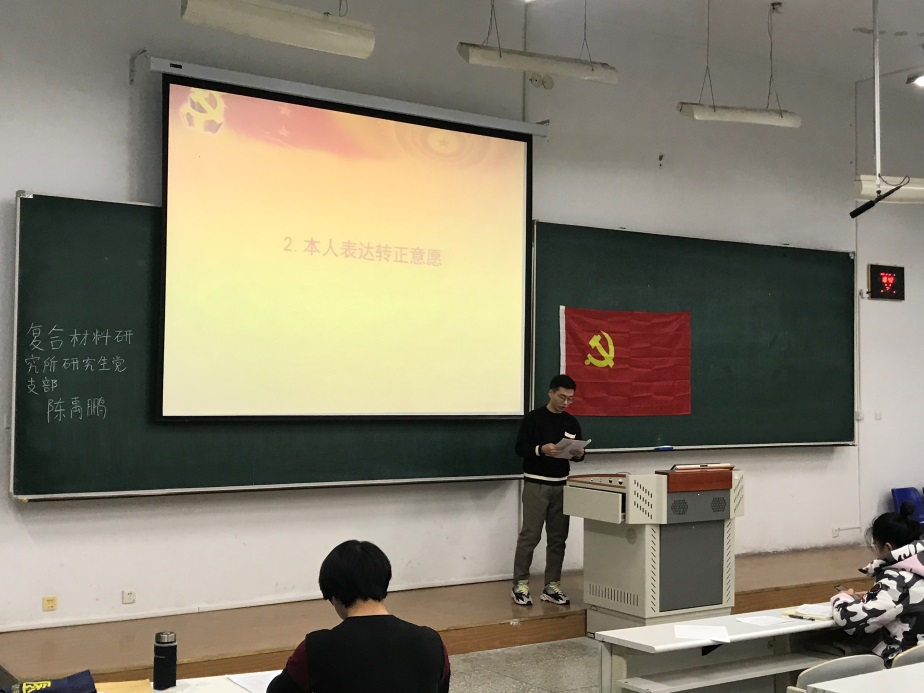 陈禹鹏同志讲到:“我于2018年11月被党组织批准为一名预备党员,这一光荣称号一直激励着我,成为我工作、学习、生活的又一新动力,我不断成长,在我预备期届满之际,我郑重向党组织提出转正申请,并对一年的工作做汇报。”