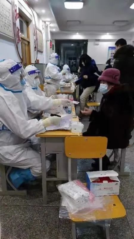1月22日晚上,我来到社区报道,在社区书记的带领下完成了一个单元(21户居民)的上门走访,送发核酸检测单并告知必须携带有效证件才可检测。这两天我自己完成了一栋七个单元,每单元七层的走访,在新结识的小伙伴的陪同下又共同走了四个七层的单元楼,在整个过程中,有时我们会碰壁没人理会,有时也会碰到热心的人让我们进去休息一下,有时也会碰到退避三舍的人,疫情期间所有的谨慎都是可以被理解的。整个走访结束后发现自己膝盖疼的不敢下楼梯,手指因为敲门也痛的不行,但我一直坚持着,因为社区的人比我们更辛苦,下午当我们刚到家不久的时候,社区的工作人员通知我们,要在检测前进行培训。我们在八十七中集合并布置了检测现场,培训结束后我们拍了一张集体照作为纪念。原本通知周日早上开始检测的我们,又一次刚到家就被通知马上集合准备检测,但是到了现场由于医生还未到场,情况无法确定,志愿者便被通知回家,一路坎坷,我们最后在晚上完成了自己的核酸检测。为了能够为更多人尽早检测,医护人员及社区工作人员坚守到零晨一点多。