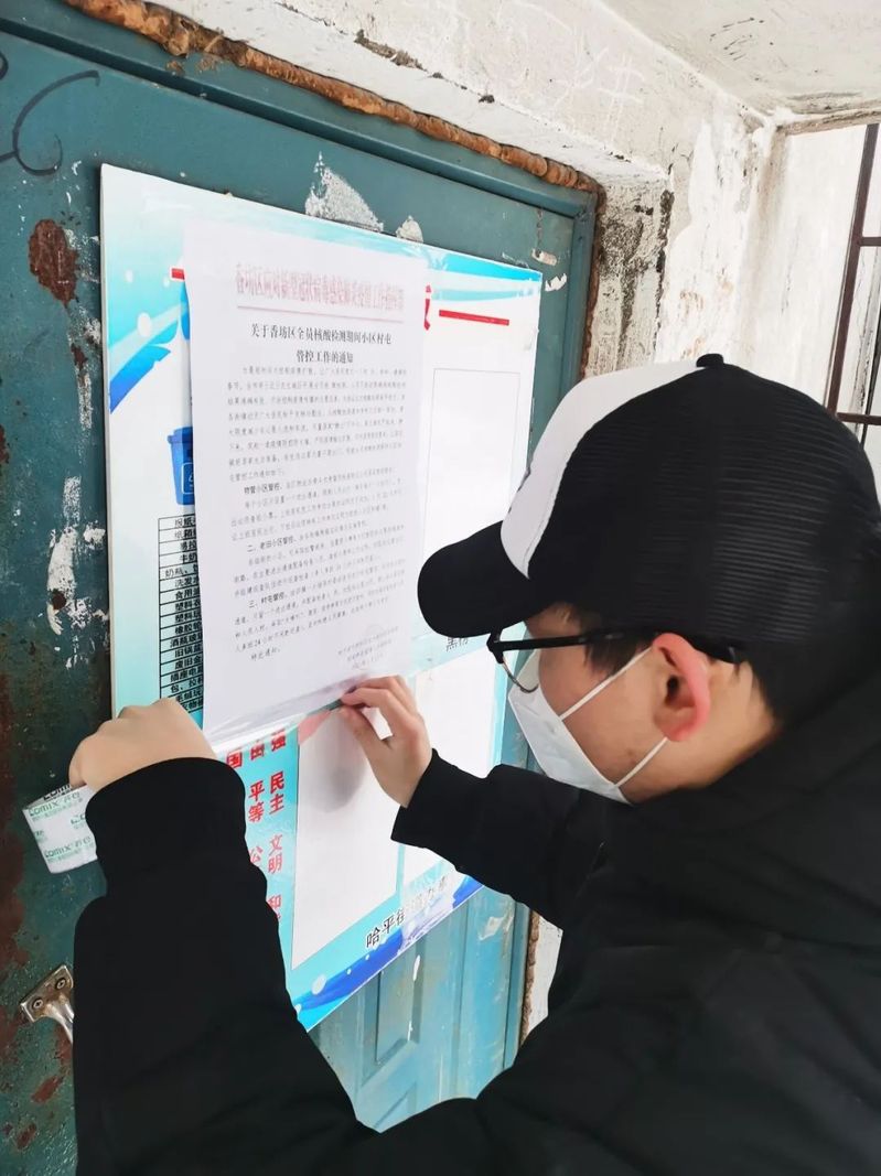 1月25日,我和我其他志愿者一同到哈平街道体工社区进行抗疫工作,协助社区主任进行流调工作。下午回到核酸检测点回收检测工作留下的电脑等设备,随后我们一同将香坊区疫情防控指挥部下发的文件张贴到体工社区每栋住户楼的门前。至此我的志愿者工作全部完成。