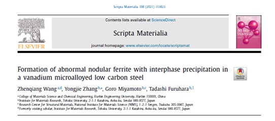 近日,pp电子官方网站王振强副教授联合日本东北大学张咏杰博士等(古原 忠教授课题组)在低碳含钒钢中发现了一种罕见的“结节状”铁素体组织,并对其形貌、晶体学及内部相间析出相进行了研究。该研究成果已在金属材料顶级期刊《Scripta Materialia》发表。