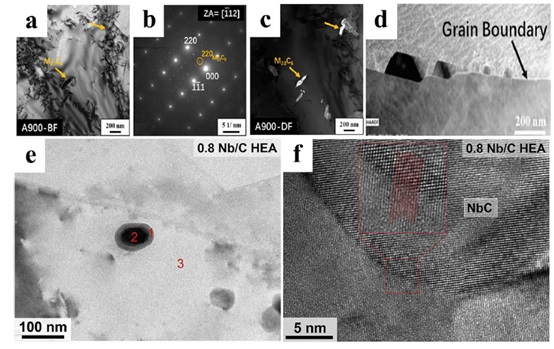 在900°C下时效的Al0.3Cu0.5FeCrNi2 HEA:a) M23C6在基体中析出。b) 衍射花样。c) 暗场图像由b)中的(220)-M23C6拍摄。 d) 晶界处沉淀。(CrMnFeCoNi)98.4Nb0.8C0.8 HEAs的显微结构:e) TEM-暗场图像显示了核壳结构。f) HRTEM图像显示基体和NbC颗粒之间的共格性。