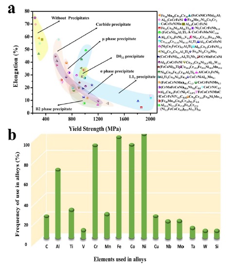 (a)纳米相主要包括碳化物、μ相、D022沉淀相、σ沉淀相、L12沉淀相和B2沉淀相。其中,L12和D022沉淀相能有效强化合金,同时保持良好的塑性。碳化物可以保持合金的塑性,但对强度的贡献不大。而μ、σ和B2相通常对合金的塑性有负面影响。(b)在纳米相强化HEAs中,Cu、Mn、Al、Co和其他一些元素的使用频率发生了变化(样品数量为60)。这主要是由于Mn和Cu在时效过程中对合金性能的负面影响,而Al和Co被广泛用作纳米相的形成和稳定元素而被大量使用。