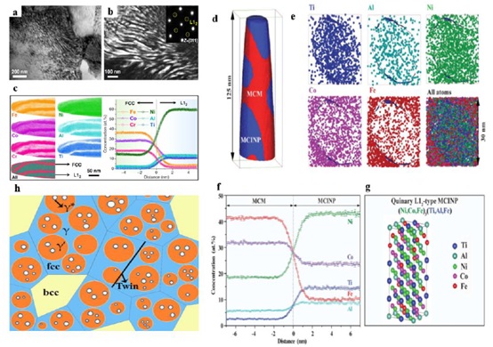 (a)TEM-明场图像显示了(Ni1.5FeCoCr0.5)87.5Al7.5Ti5.0 HEA中纳米层状结构的形貌。(b)暗场图像显示纳米片层具有L12结构。(c)APT表明纳米层状结构主要由Ni3(Al,Ti)组成。(d)APT的三维重建,显示(FeCoNi)86A17Ti7合金中的纳米复合显微结构。(e)对应的3D-APT原子图显示了典型L12沉淀相中的原子分布。(f)通过基体和纳米颗粒的近直方图揭示了MCINPs的多组分性质。 (g)通过(FeCoNi)86A17Ti7合金的(DFT)计算,对L12 MCINP的晶体结构和位置占有率进行排序。(h)由γ基体(蓝色)和层状晶内沉淀物(即原生γ’沉淀物(橙色))组成的显微结构示意图。次级γ*沉淀相(白色)位于初级γ'沉淀相中。