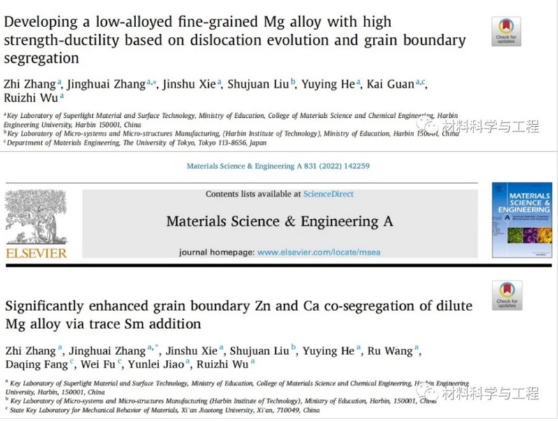 近期,pp电子官方网站的张景怀课题组综合利用晶界偏聚和位错调控开发出低合金化高强塑性细晶镁合金。相关论文分别以“Developing a low-alloyed fine-grained Mg alloy with high strength-ductility based on dislocation evolution and grain boundary segregation”和“Significantly enhanced grain boundary Zn and Ca co-segregation of dilute Mg alloy via trace Sm addition”为题发表于Scripta Materialia和Materials Science & Engineering A。
