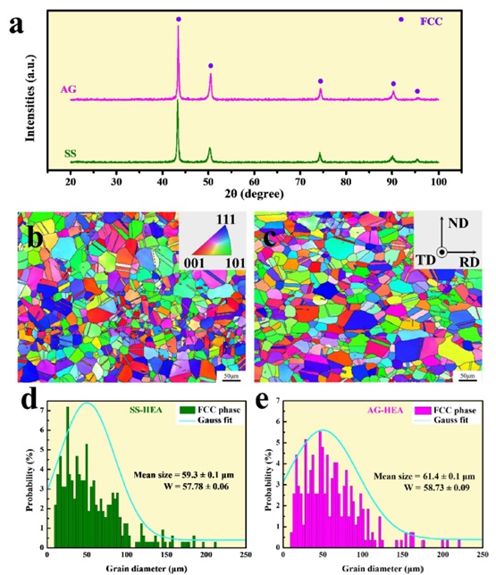 图 2. SS和AG的相组成和微观结构。(a) SS和AG样品的XRD图谱。(b)和(c)分别为SS和AG样品的EBSD图像。(d)和(e) SS和AG样品的晶粒大小分布。