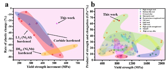 图8.Ashby图显示了新型纳米相的优势,以及新型HEA与其他高性能合金的屈服强度和塑性的比较。(a) L12-Ni3Nb与L12-Ni3Al、D022-Ni3Nb和碳化物在提高合金屈服强度和塑性变化率的结果比较。(b) AG试样和其他高性能合金的屈服强度和和塑性间的比较。