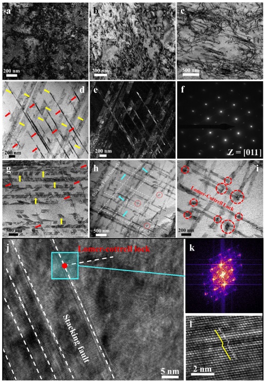 图 6. 应力加载后SS和AG的显微组织变化。(a-b) SS和AG样品分别在拉伸试验前的明场图像。(c-d) SS和AG样品在拉伸试验后的明场图像,分别显示SS和 AG样品中的位错和SF特征。(e-f) SF的暗场和选区衍射图像。(g) AG样品在拉伸试验后的暗场图像,显示了不同观察角度下的SF。(h) AG样品在拉伸试验后的暗场图像,显示{111}滑移系统上的相交SF。(i) 来自(h)的明场图像显示LC锁是在SF网格的交汇处形成的。(j)来自(i)的HRTEM图像,表示相交的SF网格(白色虚线)和LC锁(红点)。(k)来自(j)的FFT图像,显示了相交SF的存在。(l)代表性的 SF的放大图,展示了BCABABCA的堆叠顺序。