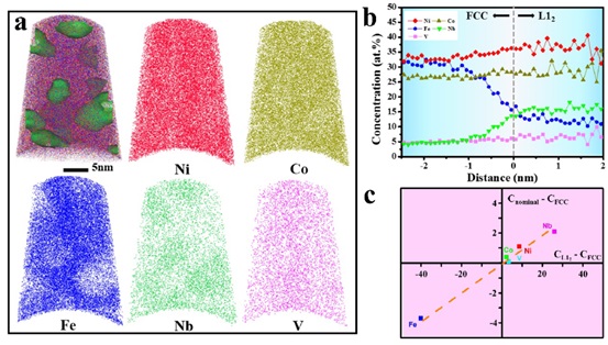 图 4. 纳米相的形貌、组成和体积分数。(a) Ni、Co、Fe、Nb和V的APT元素分布图。(b)基体和L12相界面的成分分布图。(c)通过杠杆定理计算沉淀相的体积分数。