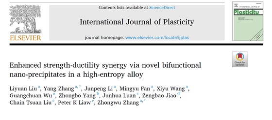 导读:具有单相面心立方结构的高熵合金(HEA)具有优异的塑性,但强度普遍较低。沉淀强化是提高合金强度最有前景的方法之一。然而,强度-延展性的制约经常限制合金性能的改善。为了克服这个问题,课题组通过引入新型双功能L12-Ni3Nb纳米相,开发了一种具有优异强度和延展性协同作用的新型 Ni35(CoFe)55V5Nb5 HEA。这种HEA具有855 MPa 的高屈服强度、1302 MPa 的极限抗拉强度和约50%的高延伸率。第一性原理计算表明,L12结构的(Ni24Co18Fe6)3(Nb10V4Fe2)纳米相比D022结构的形成能低。新型纳米相提供了双重功能。一方面,L12-(Ni24Co18Fe6)3(Nb10V4Fe2)纳米相具有较高的反相畴界能,通过沉淀强化有助于显著提高屈服强度。更重要的是,沉淀相的析出降低了合金基体的层错能(SFE),通过在变形过程中激活层错网格和Lomer-Cottrell锁的连续形成,有助于获得优异的加工硬化能力和大塑性。该研究受到国家重点研发计划、中核集团青年英才计划菁英项目、国家自然科学基金等项目支持。论文由pp电子官方网站张中武教授团队联合中国核动力研究设计院、香港理工大学、香港城市大学和美国田纳西大学共同完成。研究成果发表在《International Journal of Plasticity》,该期刊是力学和机械工程领域高水平期刊。pp电子官方网站在读博士生刘力源为第一作者,张洋副教授和张中武教授为共同通讯作者。