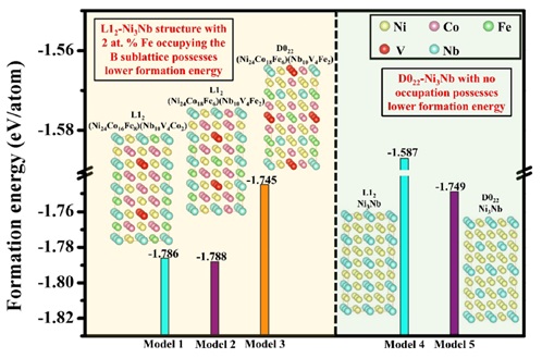 图 5. 不同成分的L12-和D022-Ni3Nb结构的形成能。模型1-3显示了A3B型L12和 D022结构的形成能, 其中2 at.% Fe或Co占据B亚晶格。模型4和5展示了不同晶体结构(L12和D022)对Ni3Nb形成能的影响。