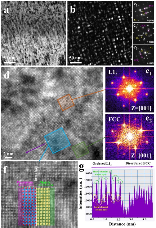 图 3.纳米相的结构。(a)明场和(b)暗场图像显示纳米相在基体中均匀分布。(c)沿[001]、[011]和[112]衍射轴的选区衍射图像,证明纳米相具有 L12结构。(d) HRTEM 图像。(e) FFT图像证实了(d)中沉淀相和基体的晶体结构。(f) 显示沉淀相和基体之间界面关系的原子排列图。(g)沿(d)中紫色箭头标记的强度分布,表示两相中原子层的排列。