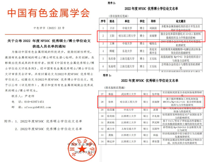 近日,中国有色金属学会正式公布2022年度中国有色金属学会(NFSOC)优秀硕士/博士学位论文奖评选结果,我院巫瑞智教授团队王阳博士学位论文《微合金化和累积叠轧对Al-2Li基材料微观组织及力学性能的影响》荣获优秀博士学位论文奖、徐林硕士学位论文《基于搅拌摩擦加工和轧制制备MWCNTs/Mg-14Li-1Al复合材料微观组织与力学性能研究》荣获优秀硕士学位论文奖。