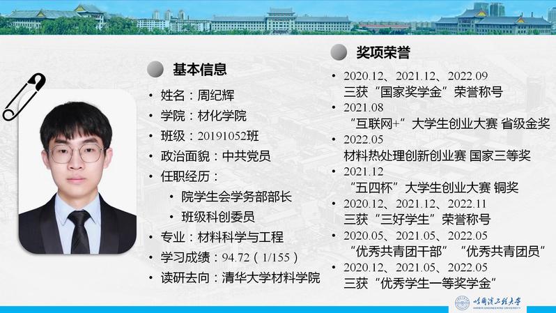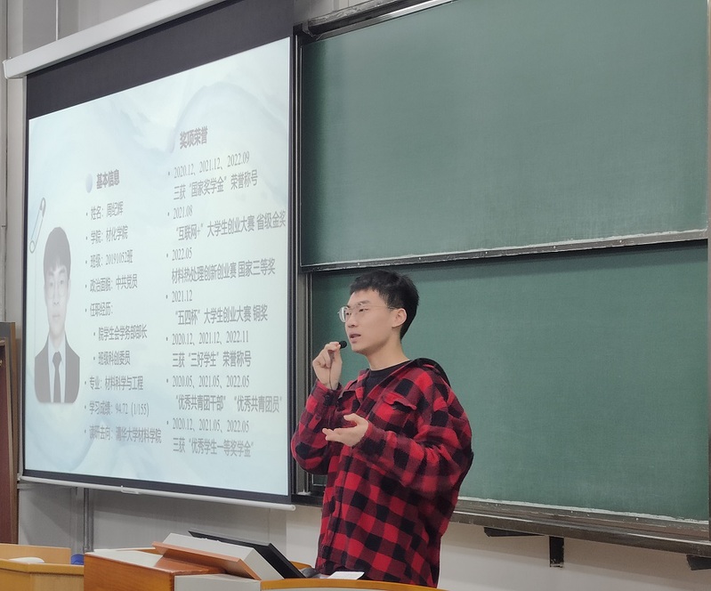 周纪辉由“缺陷”这个词引出自己对材料科学与工程专业的理解,即缺陷在材料学科中是值得探索与关注的话题,随后将自己的大学生活分为探索期、上升期、稳定期三个阶段展开述说。