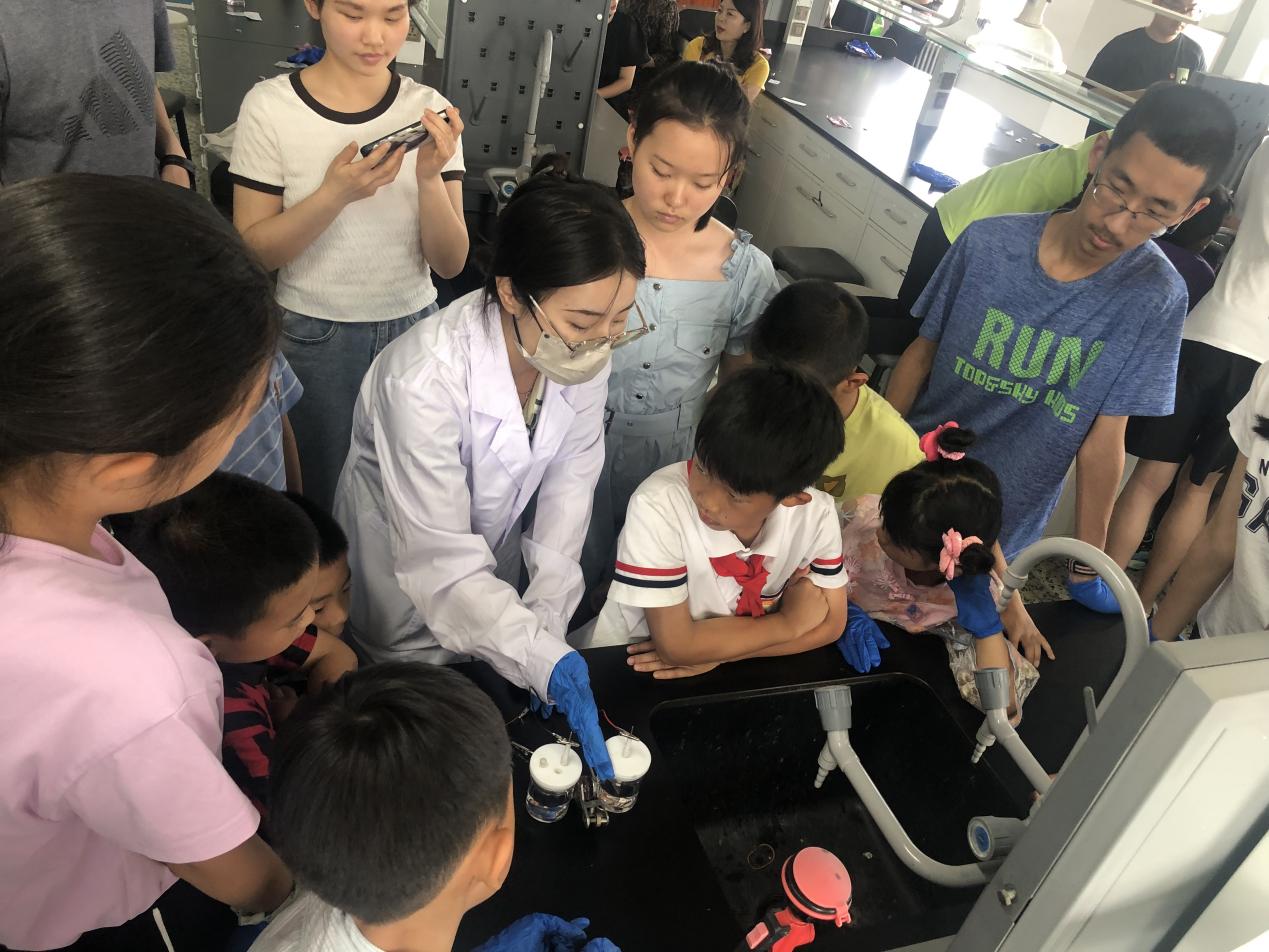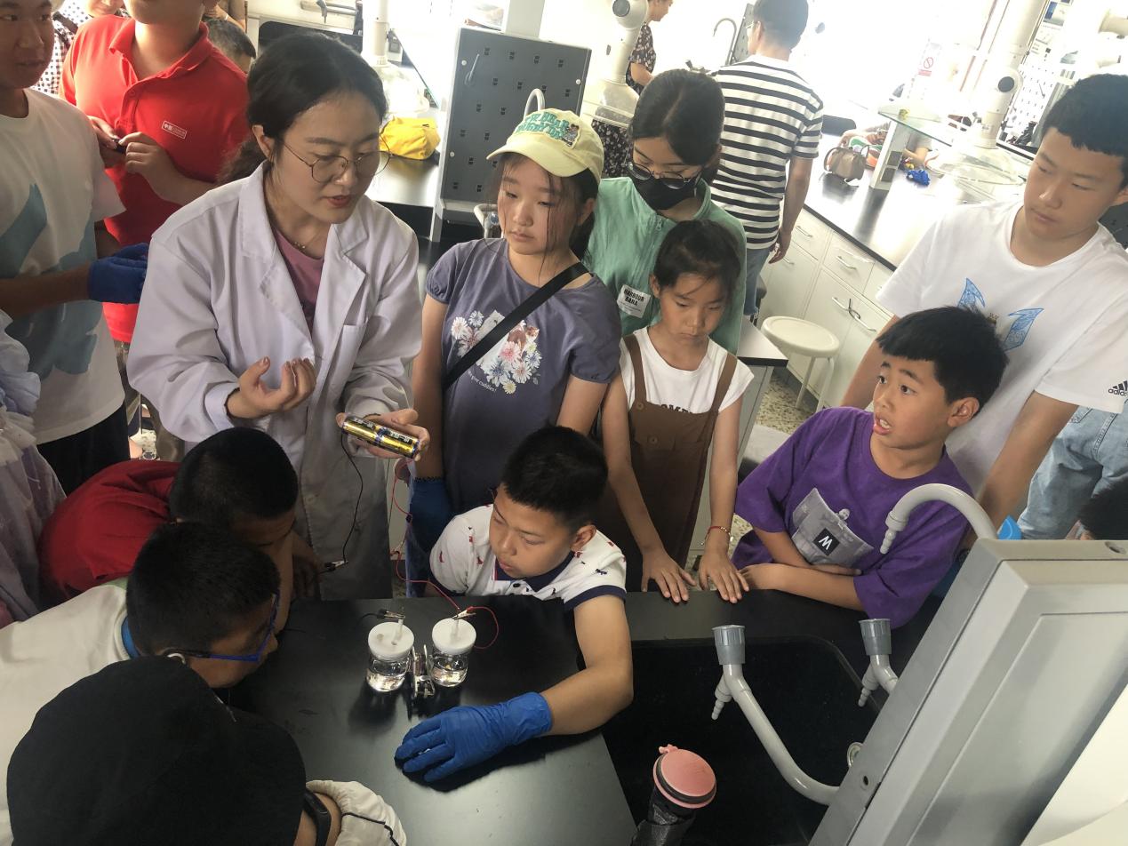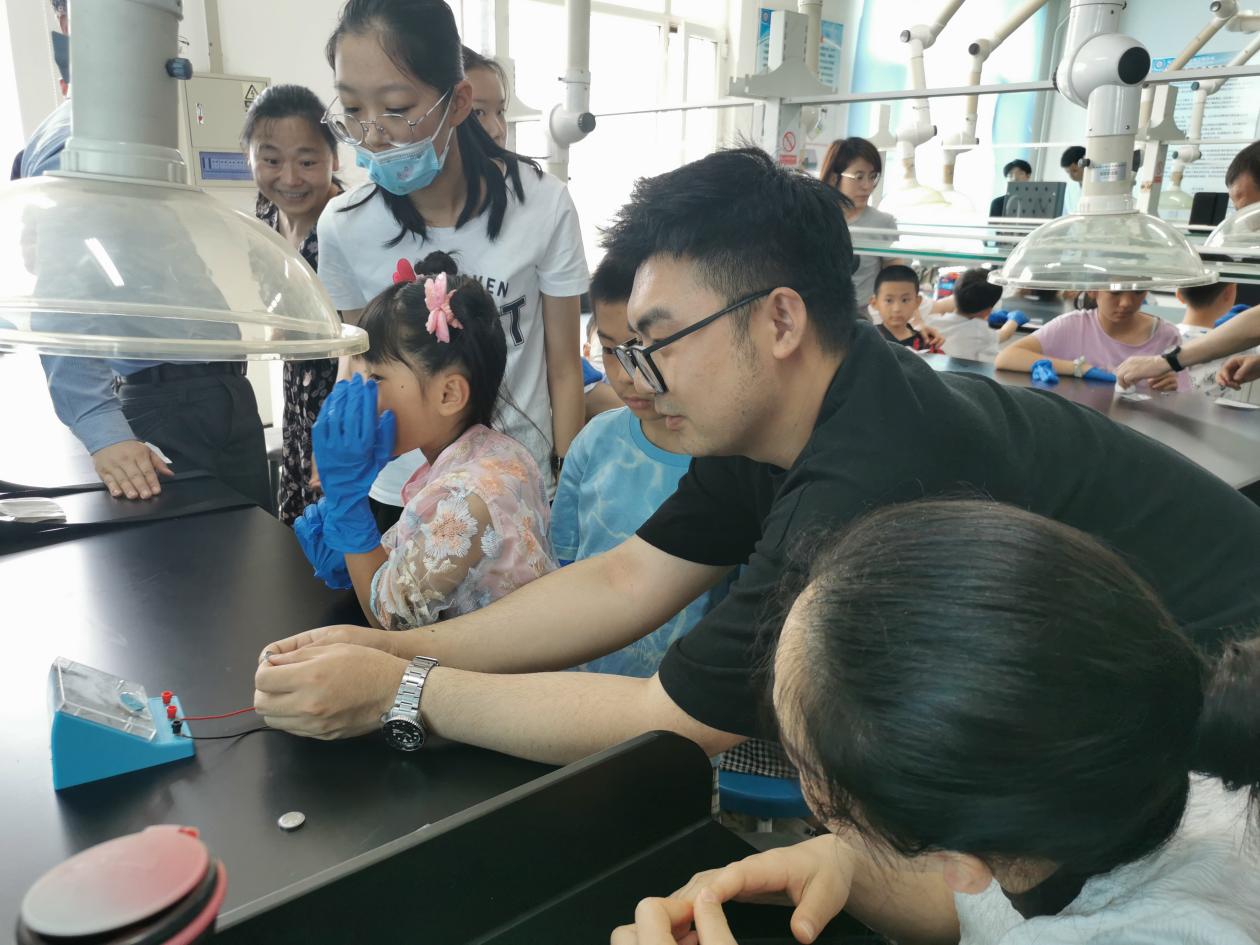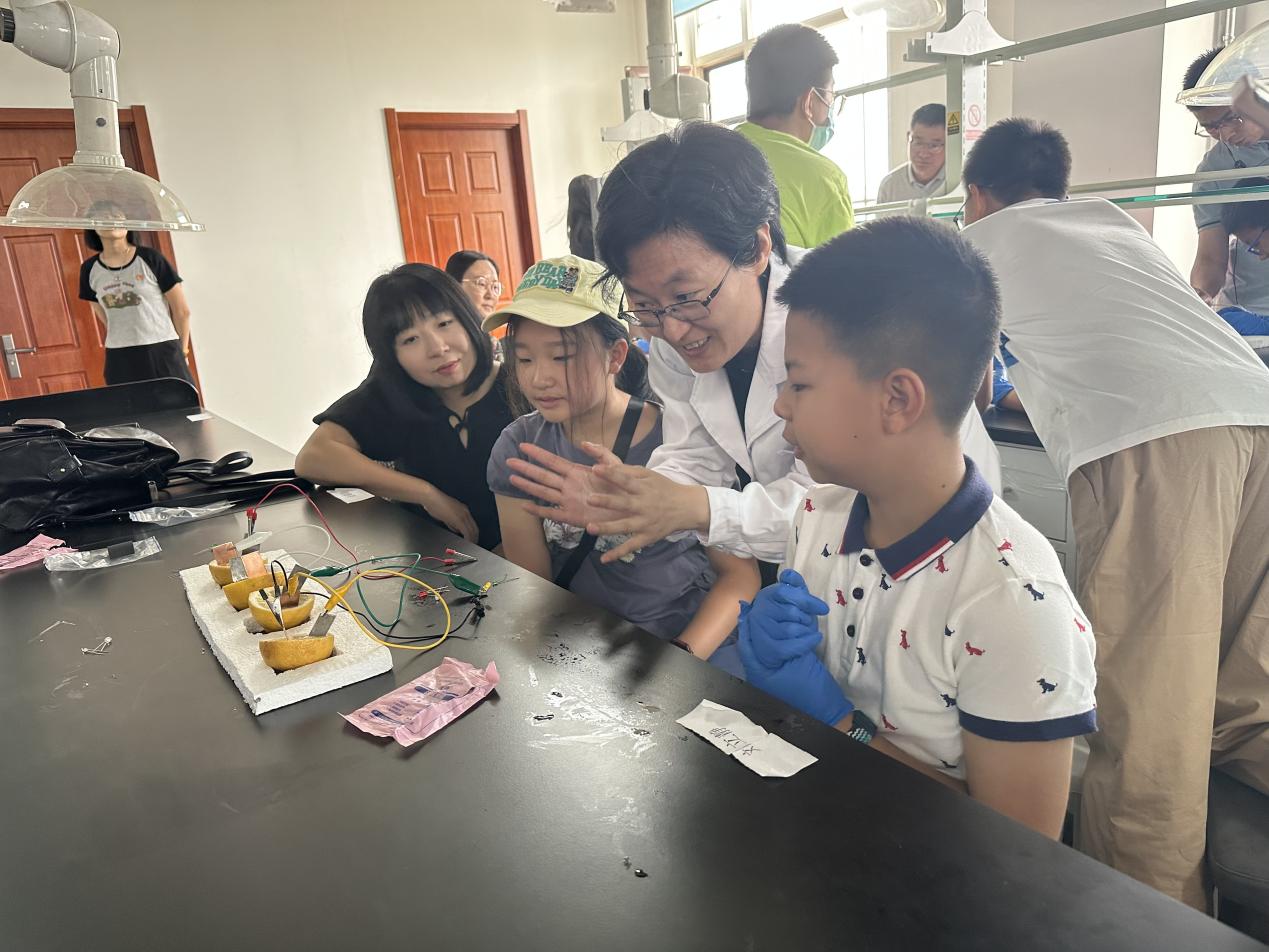 接下来由实验教学与分析测试中心教工党支部书记白建伟、党员苏守政,新能源材料与化学工程研究所教工党支部书记殷金玲、党员朱凯、高胤羲、姚佳欣、宫琳丹、王玉丹,海洋资源与环境化工研究所教工党支部书记赵方波依次为孩子们开展了扫描电子显微镜下神奇的微观世界、物理法产电、水果电池、锌离子电池、电镀铜、电解水制氢、创意百变水球、膜法处理污水实验。学院学生党员、入党积极分子志愿者李卓、刘力宁、孙鹏、赵丹、张鸿举、刘华宇、王丹、吴明聪配合讲解。