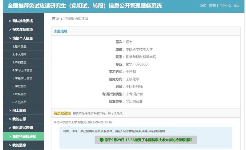 优秀来自于奋斗与坚持。从大二开始,我保持极高的专注和自律,以及对学习的热情。特别是在第三学年,我的学习成绩为92.7分,首次进入专业前三名。其实大三时,我并不觉得自己能获得保研的机会,因此抽空去考了雅思准备出国,但最后结果出乎意料,我顺利推免至中国科学技术大学化材学院。