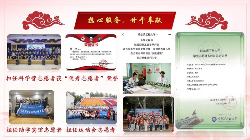 为者常成,行者常至。学习之余,张旭对社会实践和志愿活动满怀热忱。本科期间,他的志愿服务时长超300小时。他曾担任2021年青少年高校科学营黑龙江省分营志愿者,并荣获“优秀志愿者”称号;曾多次担任迎新活动志愿者;曾参加“三下乡”社会实践活动,所在的社会实践团获评2022年黑龙江省“三下乡”社会实践优秀团队。为传承哈军工优良传统,扩大哈军工精神研习人群的覆盖面,在学院领导的指导下,他创办了哈军工精神研习社,为哈工程学子深入学习哈军工优良传统的丰富内涵和时代价值提供平台。
