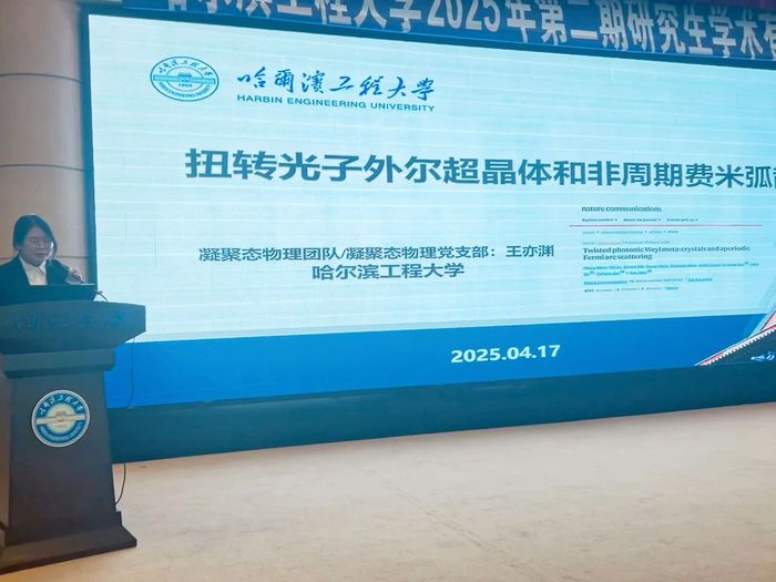 凝聚态物理团队王亦渊博士作《扭转光子外尔超晶体和非周期费米弧散射》报告。报告从拓扑光子学讲起,介绍了费米弧随扭转角度变化重构现象对新型器件设计和信息调控方式提供的参考。