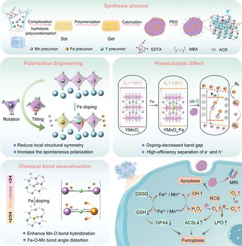 YMnO3:Fe NPs的合成过程、增强的压电催化和治疗机制示意图